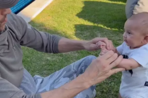 En la imagen, el bebé luce un body azul con rayas blancas y se nota que ha crecido considerablemente desde sus últimas apariciones públicas, aunque su rostro no es completamente visible.